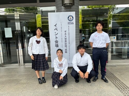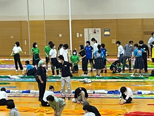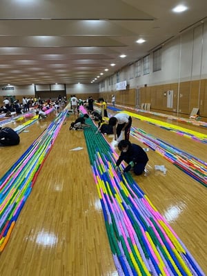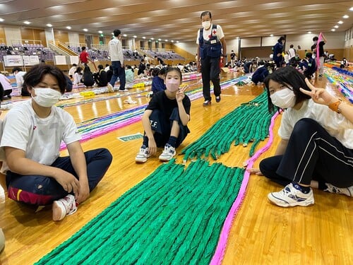 9月23日(金)、県立総合体育館にて各団体が作成したおりづるをつなげる作業を行いました。本校からも生徒4名が参加し、担当した約20万羽のおりづるをつなげる作業を行いました。本校3年唐木田さんは、「戦争のない世界を願いながら折られたツルが本当にたくさん集まっているのを目の当たりにしました。関わりのない人たち同士が折ったツルだけど、それをつなげるという作業を通して、平和に対する思いを共有することができました」と感想を述べてくれました。