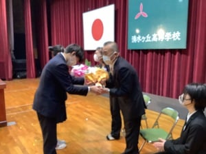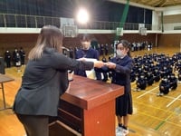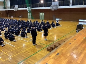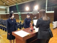 過去ブログ · 2023/03/19 修了式、離退任式の実施 令和5年3月20日(月)、各種表彰が行われ、その後修了式と離退任式が実施されました。 まず、各クラブの表彰の及び一年間休まずに登校した生徒への皆勤表彰がありました。その後、修了式では次の年度に向けて自覚を高めていくよう校長先生から言葉がありました。最後に、離退任式では、本校を離れる先生方や、定年を迎えた先生方を感謝の花束と拍手でお送りしました。みなさん、新学期に元気に会いましょう。 tagPlaceholderカテゴリ: life