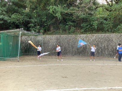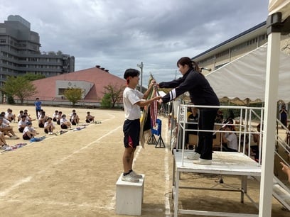 体育祭の各プログラムでは全員が一生懸命競技に臨みました。今年の優勝は赤組でした。生徒全員が、それぞれのチームの健闘を称えお互いに拍手を送りました。クラス旗の表彰も行われました。