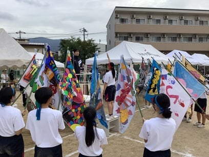 今年の体育祭では数年ぶりに行進が行われ、各クラスが作成したクラス旗とともに生徒が入場しました。開会式では、ソフトボール部主将西本さんによる選手宣誓が行われ、最高の体育祭にする意気込みが述べられました。