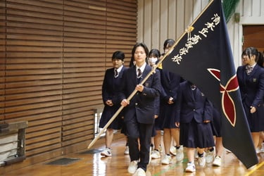 その後、第77回呉地区高等学校総合体育大会に参加する運動部の壮行式が行われました。ソフトボール部、男子ソフトテニス部、女子ソフトテニス部、バスケットボール部、バレーボール部より前回の優勝カップが返還され、校長先生並びに生徒会長より激励の言葉をいただきました。選手を代表して女子ソフトテニス部より平岩さんが選手宣誓を行いました。この総合体育大会でよりよい結果を残そうとそれぞれのクラブで毎日一生懸命練習をしています。自分たちが積み上げてきた力をいかんなく発揮できる大会となるよう、みんな応援しています。頑張れ、清水ケ丘高校生!