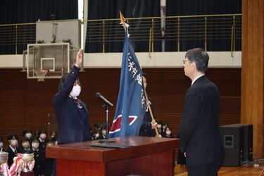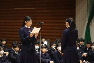 4月10日(水)、新入生と在校生が初めて一堂に会する対面式が行われました。生徒会長の舛田さんより歓迎の言葉が述べられ、新入生を代表して山岡さんが学校生活の意気込みを述べました。そして代表者同士の握手が行われ、これから1つのチームとして学校生活を共にしていく気持ちを共有し、対面式を終えることができました。