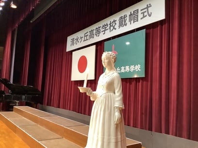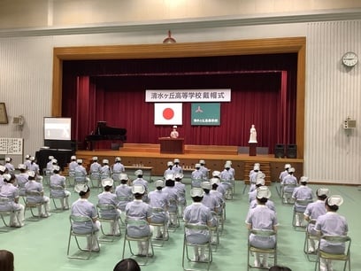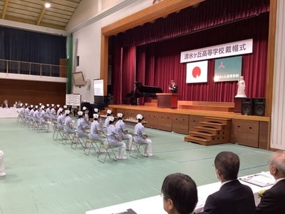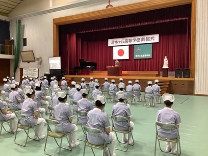 10月15日、清水ケ丘高等学校看護科、令和6年度第8回戴帽式を行いました。戴帽式とは、看護に携わる者がその道に進む決意を表明し、看護師の象徴であるナースキャップを戴く儀式です。本年度は呉市長 新原芳明様、独立行政法人国立病院機構呉医療センター・中国がんセンター院長 繁田正信様をはじめ、多くの来賓の方々をお迎えしての、厳粛な式となりました。