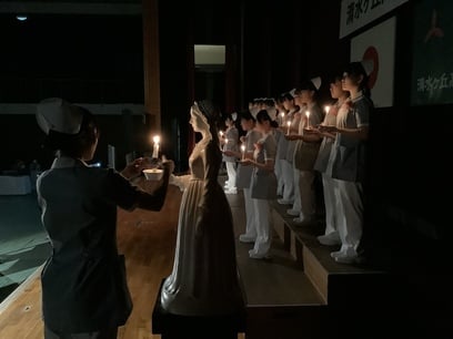 戴帽式では一人ひとりにナースキャップが授与され、全員でナイチンゲール誓詞を唱和し、看護師としての第一歩を踏み出しました。「仲間と一緒にこの日を迎えられて嬉しいです。みんなで支え合いながら成長していきたいです。」という思いを伝えてくれた生徒もいました。私たち教員にとっても、生徒たちの成長を見守ることのできるこの瞬間は非常に感慨深いものです。戴帽式を迎えた生徒たちは、これから授業や実習に向けさらに努力を続けます。今後素晴らしい看護師へと成長し、多くの患者さんに寄り添う姿を楽しみにしています。