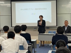 学校生活 · 2024/10/17 令和6年度議会報告会(意見交換会) 令和6年10月16日(水) 参加生徒:高校3年生普通科進学コース、「社会演習」履修者 呉市議会議員の「民生委員会」8名をお迎えして、意見交換会を実施しました。本校生徒による司会のもと、生徒6名が質問を行い、それぞれの質問に対して各2名の市会議員の方が答えてくださいました。最後に生徒代表が謝辞を述べて終わりました。生徒からは、「議会のことが少し理解できました。今月27日の私たちの初めての選挙の際はしっかりと考えて投票に行きます。」と感想を述べてくれました。 tagPlaceholderカテゴリ: life