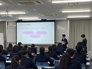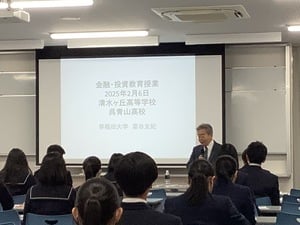 早稲田大学から、教育・総合科学学術院 経済学博士教授 藁谷先生、同じく、教育・総合科学学術院 教授 熊谷先生、及び学生2名の方々に本校にお越しいただき、講義をしていただきました。