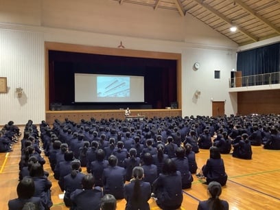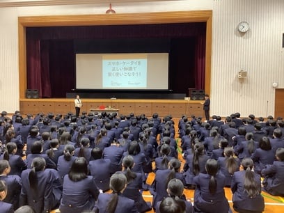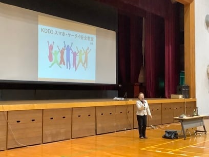今年は講師としてKDDIより小林様に来校していただき、SNS上で起こったトラブル、携帯・スマホ依存、闇バイトに関するトラブル事例を映像と共に話を聞き、学ぶことができました。