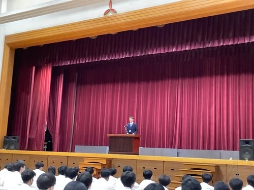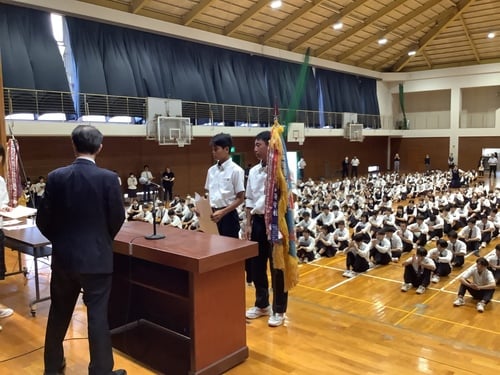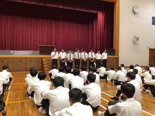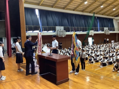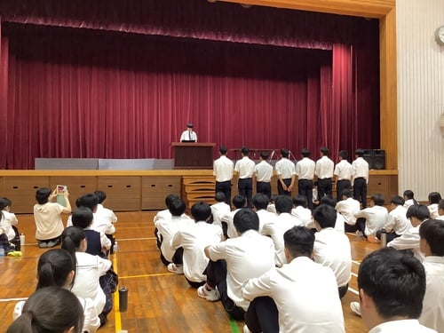 7月22日(火)、令和7年度全国高等学校総合体育大会に参加する男子ソフトテニス部への壮行式が行われました。