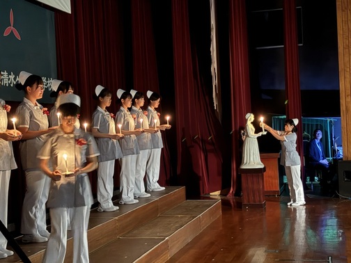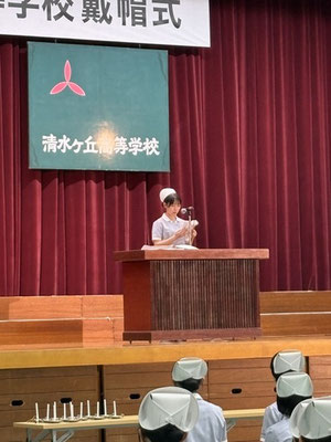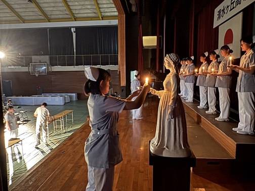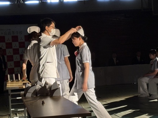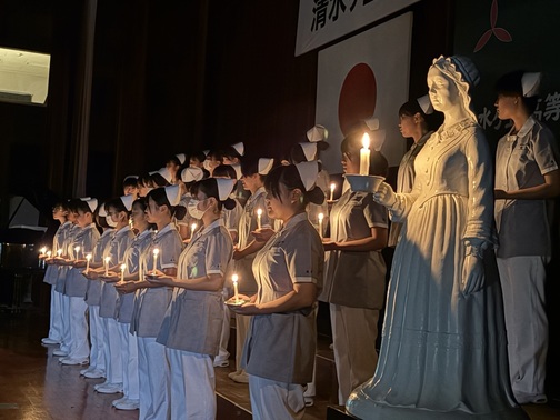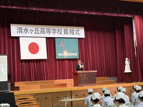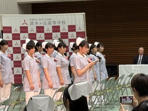 10月14日13時より、清水ケ丘高等学校看護科1年生が戴帽式を迎えました。戴帽式とは、看護に携わる者がその道に進む決意を表明し、看護師の象徴であるナースキャップを戴く儀式です。ナイチンゲール像から灯火を受けとり、ひとりひとりが看護の道を志す者としての責任と使命を胸に刻みました。厳粛な雰囲気の中にも、あたたかな希望の光が感じられる式となりました。