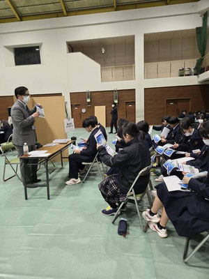 この活動は、就職や進学をする際に、どのような心構えをしておけばよいのか、また、その進路先ではどのようなことをするのか等について理解を深めるために実施しています。どの生徒も熱心にメモをとりながら、お話を聞いており、自分の進路について考える良い機会となりました。ご協力いただいた関係者の皆様、誠にありがとうございました。