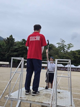 令和7年9月23日(火)、第75回清水ヶ丘高等学校体育祭が行われました。昨日までの秋晴れが一転、雨空が広がりを見せ、悪天候の中での開会式となりました。選手宣誓は、女子ソフトテニス部主将の小保さんが行い、立派な意気込みが感じられました。雨の中でも、生徒全員が一丸となり、体育祭の競技をやりきりました。たくさんの保護者の方々にも来校いただき、生徒たちの元気な姿を見ていただくことができました。 今年のスローガンは「耐雪梅花麗」。多くの苦難や試練を乗り越えて人は大きく成長するということを言い表しています。このスローガンに言い表されているように、悪天候にもかかわらず、生徒一人一人が一生懸命努力し、チームで団結し、全体として良い体育祭を作り上げることができました。 今年の優勝は黄組(1年生)となりました。体育祭で経験した学年の絆を今後の高校生活にも活かしてもらいたいと思います。